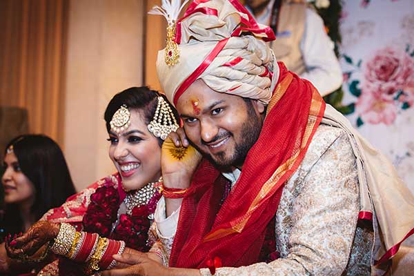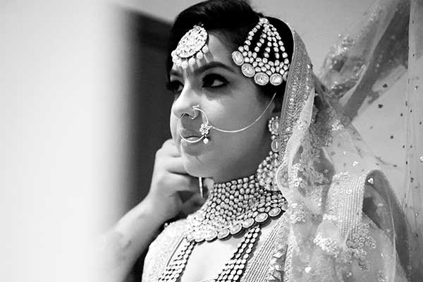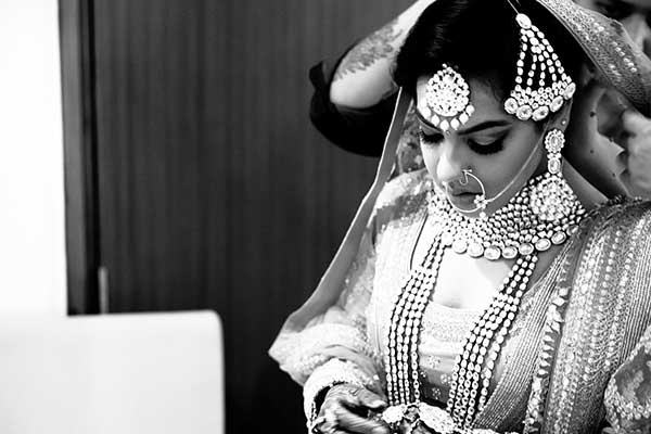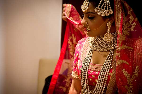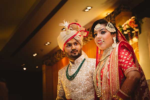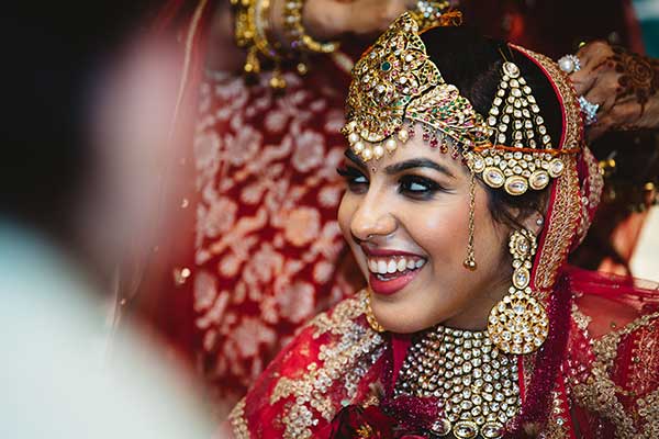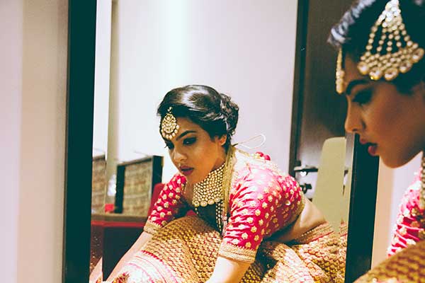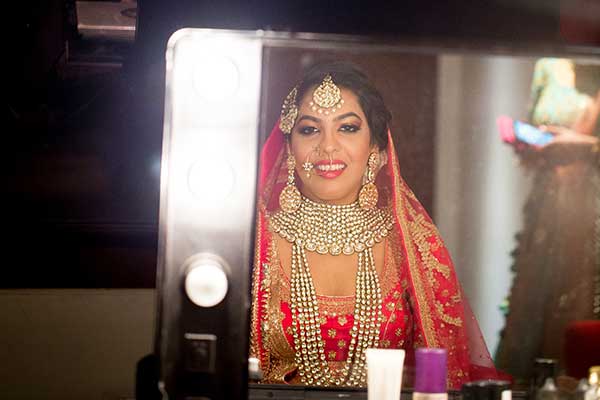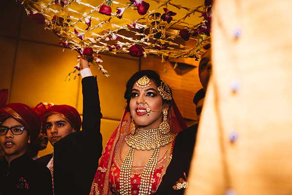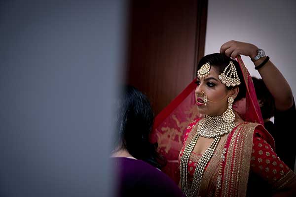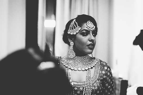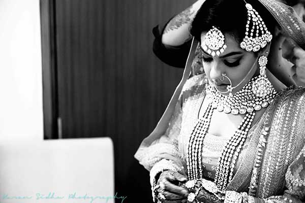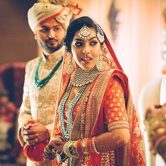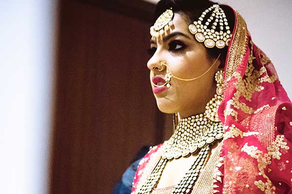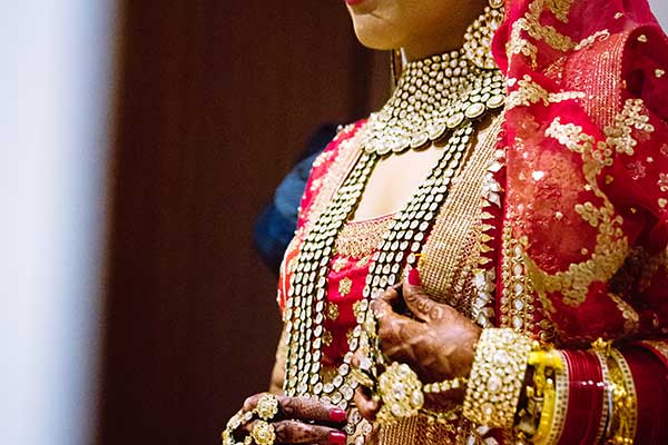 Ours was an arranged marriage. I belong to Delhi and my husband belongs to Chandigarh. Salil (my husband) and my meeting was arranged by our families in Delhi. Thereafter we met three times before saying yes to each other. Our families weren’t acquainted with each other. We belong to conservative Jain families where till today mostly marriages are arranged and first meetings are full family affairs. Considering this ours were comparatively modern meetings. Our families didn’t meet each other till we said yes. And we also didn’t meet each other’s parents till we said yes to each other. Our roka was then followed by six months long courtship wherein we got to know each other better. Our wedding took place in Chandigarh. As per our families traditions my wedding lehenga and jewellery were from my husbands side. My husband is a jeweller and he especially designed my wedding jewellery keeping my likes in mind. Jain brides rarely wear a passa/jhoomar, but I wanted to wear one. So Salil designed one for me. A part of a Jain brides jewellery is elaborate hand jewellery like hath phool or ratan chaunk. Another staple in a Punjabi Jain brides jewellery is Paribandh- which are traditional pure gold bangles with ghunghroos work between the chooda. All of my jewellery was from Jain Jewellers, Chandigarh (@jainjewellers22)