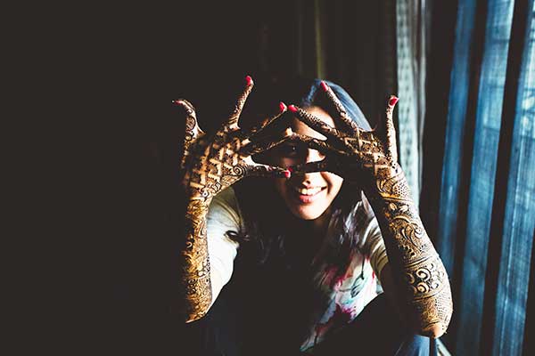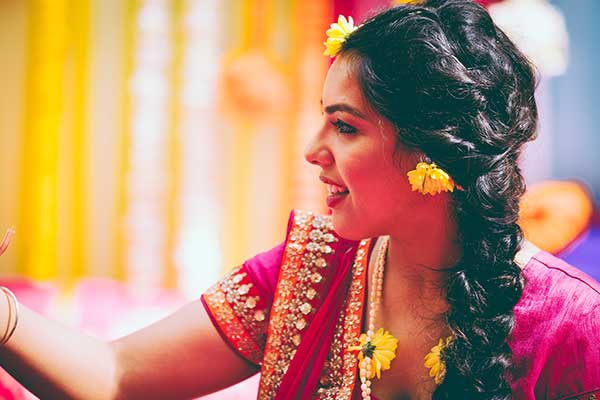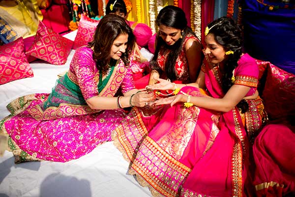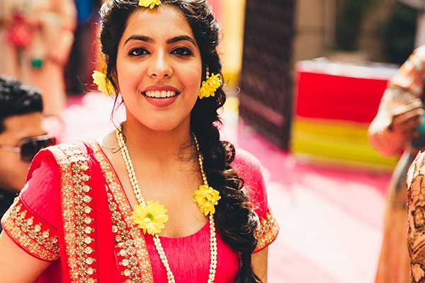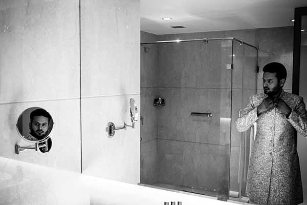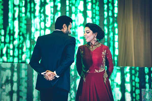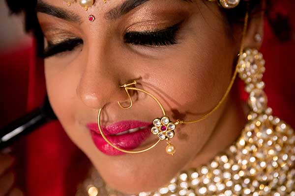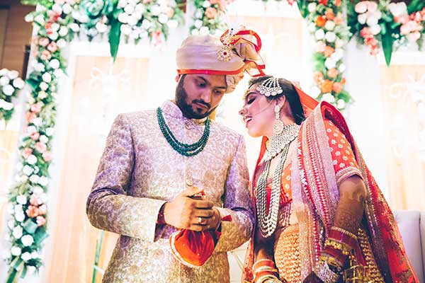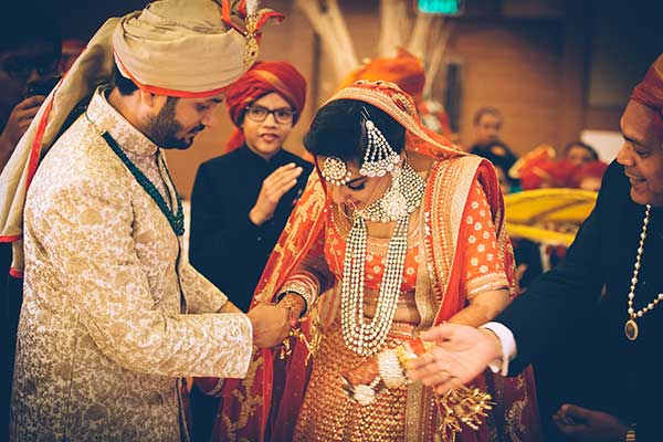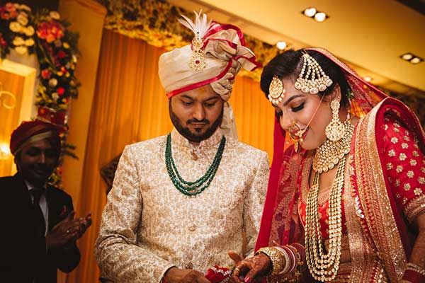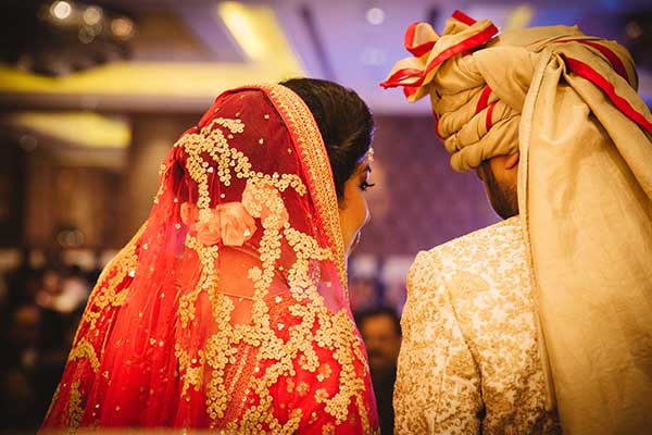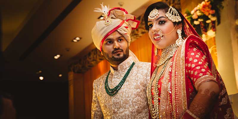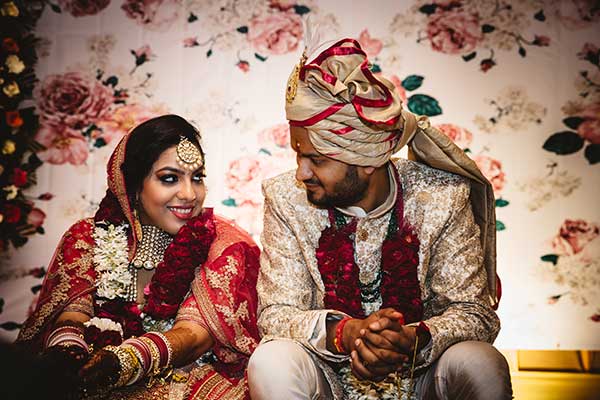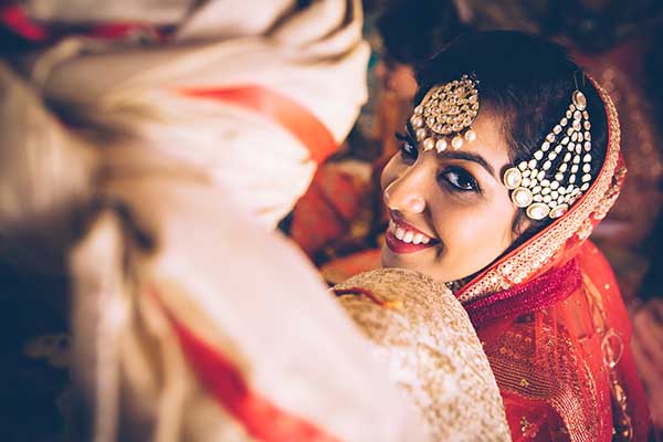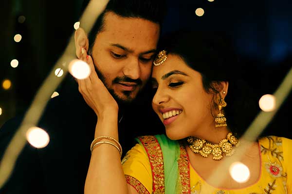 Ours was an arranged marriage. I belong to Delhi and my husband belongs to Chandigarh. Salil (my husband) and my meeting was arranged by our families in Delhi. Thereafter we met three times before saying yes to each other. Our families weren’t acquainted with each other. We belong to conservative Jain families where till today mostly marriages are arranged and first meetings are full family affairs. Considering this ours were comparatively modern meetings. Our families didn’t meet each other till we said yes. And we also didn’t meet each other’s parents till we said yes to each other. Our roka was then followed by six months long courtship wherein we got to know each other better. Our wedding took place in Chandigarh. As per our families traditions my wedding lehenga and jewellery were from my husbands side. My husband is a jeweller and he especially designed my wedding jewellery keeping my likes in mind. Jain brides rarely wear a passa/jhoomar, but I wanted to wear one. So Salil designed one for me. A part of a Jain brides jewellery is elaborate hand jewellery like hath phool or ratan chaunk. Another staple in a Punjabi Jain brides jewellery is Paribandh- which are traditional pure gold bangles with ghunghroos work between the chooda. All of my jewellery was from Jain Jewellers, Chandigarh (@jainjewellers22)
