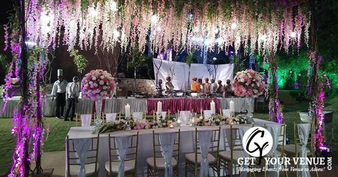 The vast expanse of verdant lawns adds subtle charm to your wedding venue. It ensures your esteemed guests having enough room to meet and greet without bumping into each other. Lovely lighting effect and floral décor make the space more elegant.