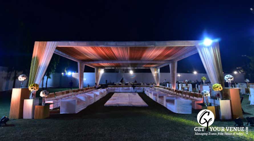 The vast expanse of verdant lawns adds subtle charm to your wedding venue. It ensures your esteemed guests having enough room to meet and greet without bumping into each other. Lovely lighting effect and floral décor make the space more elegant.