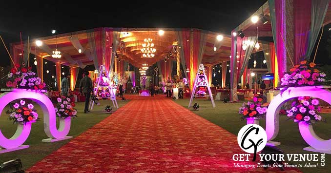 Lawn: The 19,000 sq ft. outdoor space allows you to perfectly organize all your events and wedding ceremonies. 2 Rooms with modern amenities is also available. The lawn can entertain up to 1500 guests.