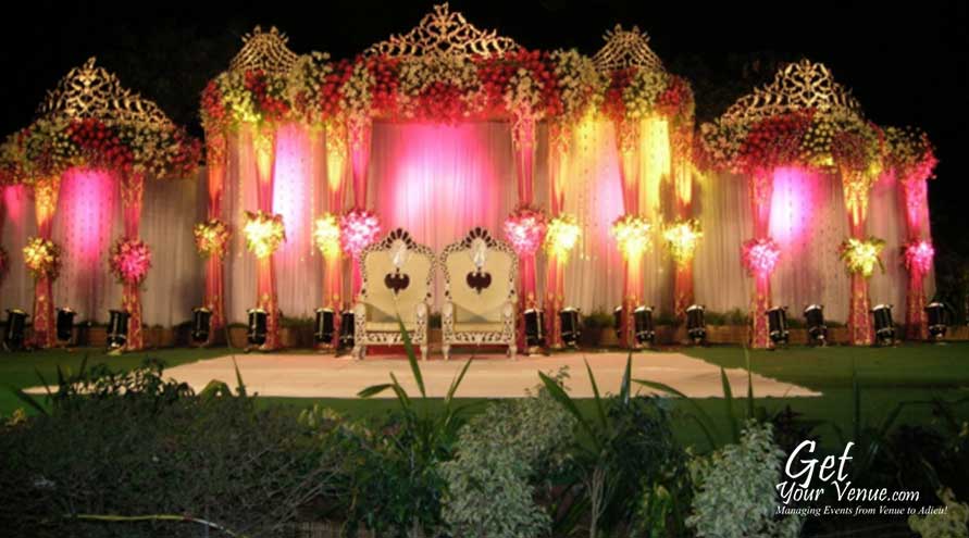 The vast expanse of verdant lawns adds subtle charm to your wedding venue. It ensures your esteemed guests having enough room to meet and greet without bumping into each other. Lovely lighting effect and floral décor make the space more elegant.