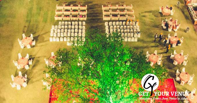 The vast expanse of verdant lawns adds subtle charm to your wedding venue. It ensures your esteemed guests having enough room to meet and greet without bumping into each other. Lovely lighting effect and floral décor make the space more elegant.