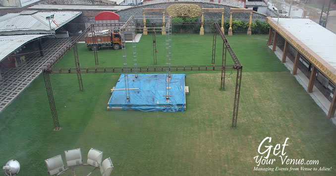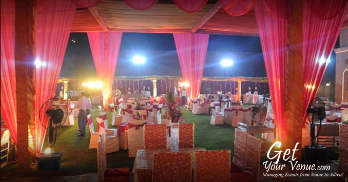 The vast expanse of verdant lawns adds subtle charm to your wedding venue. It ensures your esteemed guests having enough room to meet and greet without bumping into each other. Lovely lighting effect and floral décor make the space more elegant.