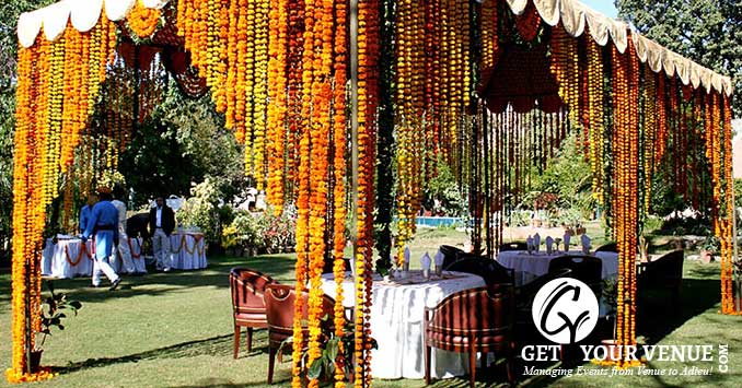 The vast expanse of verdant lawns adds subtle charm to your wedding venue. It ensures your esteemed guests having enough room to meet and greet without bumping into each other. Lovely lighting effect and floral décor make the space more elegant.