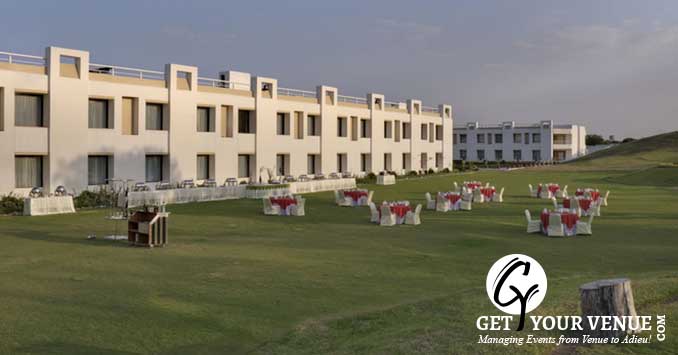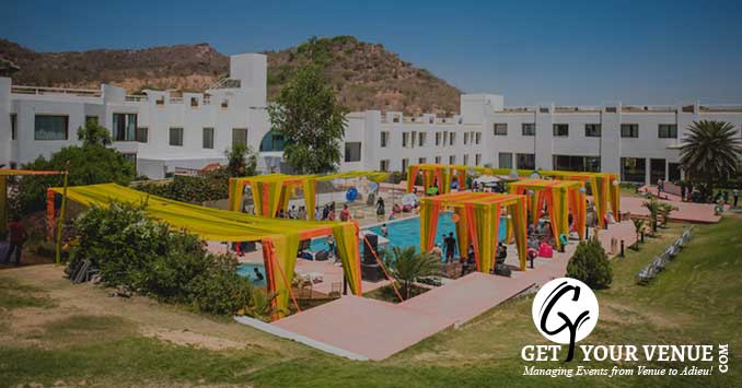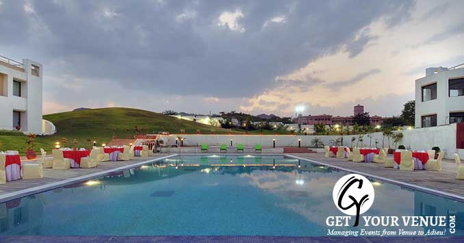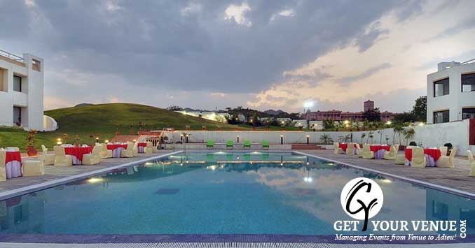 Poolside Lawn – a lawn adjoining the pool area is a well-maintained place that provides a natural green setting for a destination wedding in Udaipur and can easily seat 100 people.