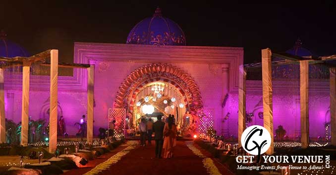 The vast expanse of verdant lawns adds subtle charm to your wedding venue. It ensures your esteemed guests having enough room to meet and greet without bumping into each other. Lovely lighting effect and floral décor make the space more elegant.