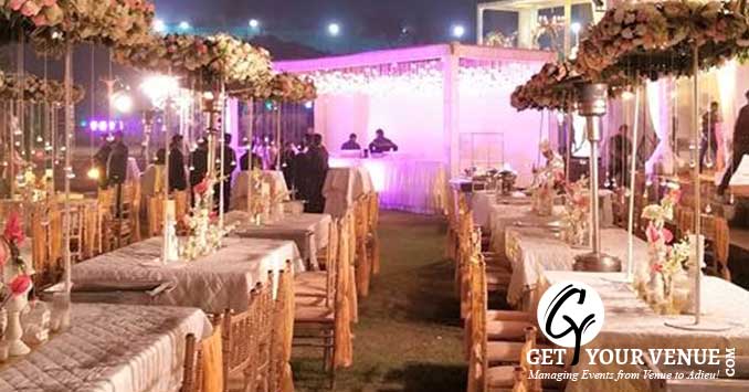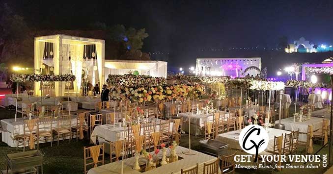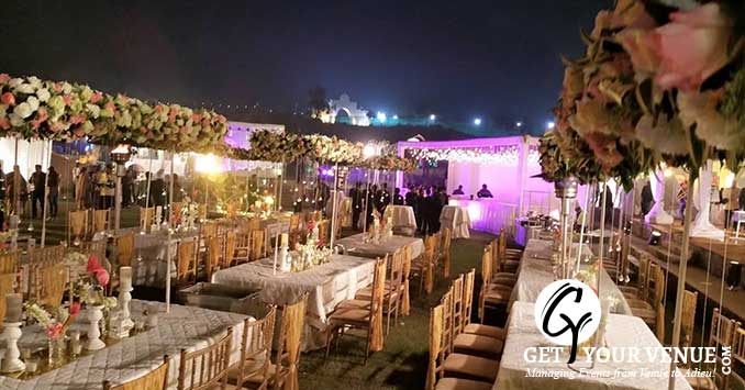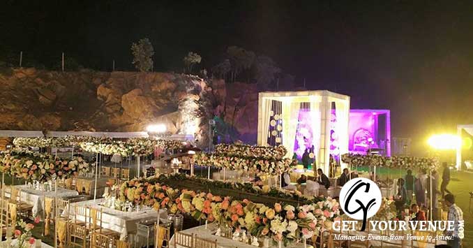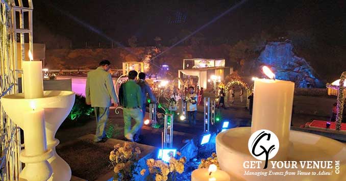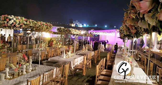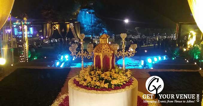 The vast expanse of verdant lawns adds subtle charm to your wedding venue. It ensures your esteemed guests having enough room for the meet and greet without bumping into each other. Lovely lighting effect and floral décor make the space more elegant.