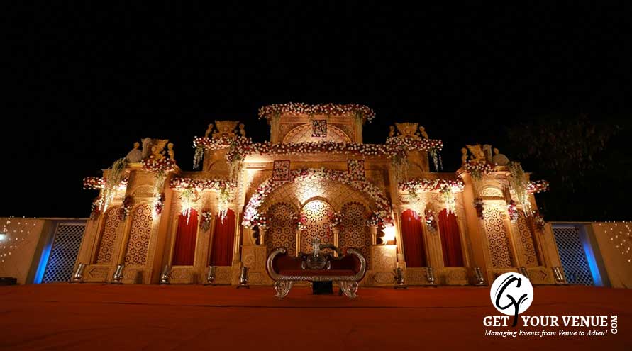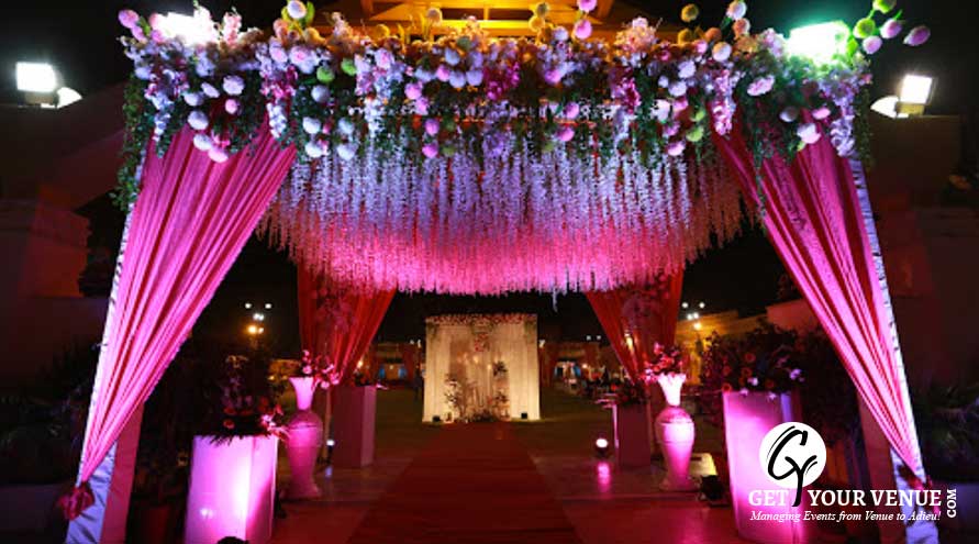 The vast expanse of verdant lawns adds subtle charm to your wedding venue. It ensures your esteemed guests having enough room to meet and greet without bumping into each other. Lovely lighting effect and floral décor make the space more elegant.