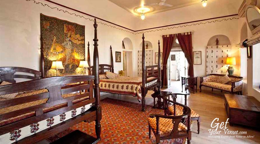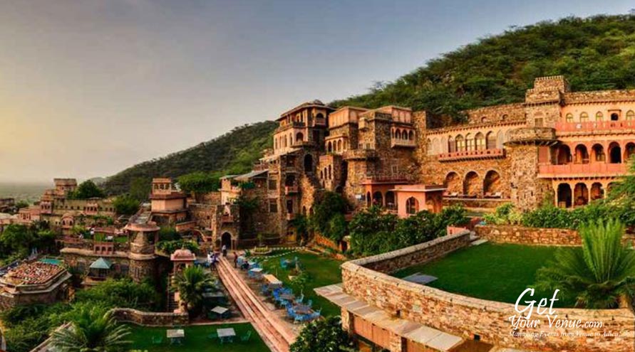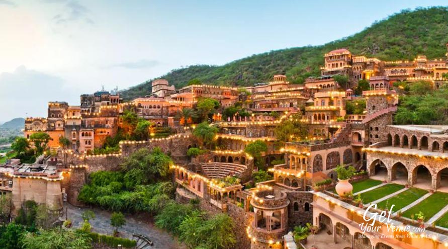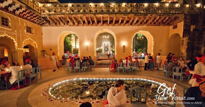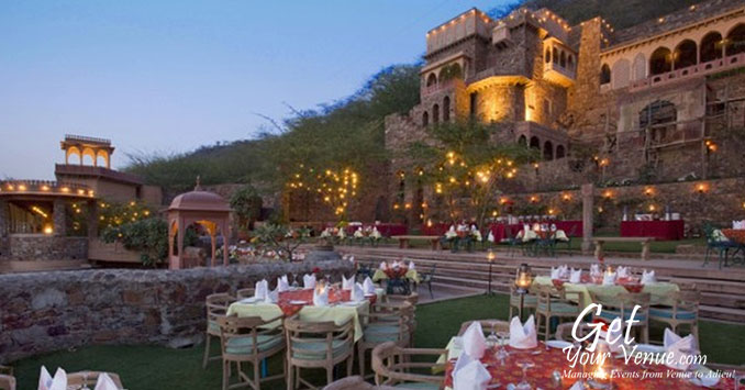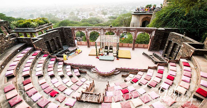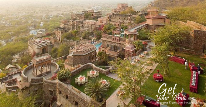 The Neemrana Fort Palace on the main Delhi-Jaipur Highway is one of the most sought after properties in the NCR region if you are willing to host a flamboyant yet elegant wedding celebration. You can charter full properties from 60 to 6 rooms. Besides the grand royal weddings, they arrange memorable private ones: on a candle lit beach, on torch-lit sand dunes, by a garden pool, on a rampart or a sea beach, or in a sprawling garden-forest. You spell it and the rest just seems to unfold like magic before your eyes.Once you choose a Neemrana wedding, you can decide how far you want to go: rose petals can automatically be showered from the skies. Or fireworks celebrate with the cosmos, as embers of silver and golden rain cascade over the facade.Court after court, the Fort-Palace changes colours with the day, enchanting the participants.Be it an open or a covered area, they have grand spaces at your disposal. So what are you waiting for? Fill out the below form now & allow our experts book this marvellous property for you!
