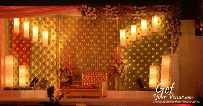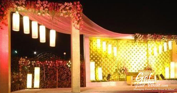 Stylish interiors, stunningly beautiful lighting effects and comfortable seating arrangements make this banquet hall perfect for a glittery wedding affair. The beautifully laid tables and chairs ensure an idyllic setting. The vast expanse of verdant lawns adds subtle charm to your wedding venue. It ensures your esteemed guests having enough room to meet and greet without bumping into each other. Lovely lighting effect and floral décor make the space more elegant.