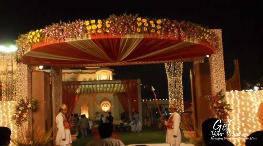 Pooja party lawn has been established in 2011 and designed to provide latest compfort, matching furniture to suit the ambience. This place has 17000 sq. ft. of greenery area, 5000 sq ft. of covered A/c halls for weeding,conference,2 bridal A/c rooms with water proof stage and chat stalls , cater gathering of 1200 persons at one time with enough parking space. This is the amongst the best party lawn in East Delhi and Ghaziabad. The place is based on Rajasthani Theme with Golden & Red color combination. they provide other services such as catering with best culinary delights by our master’s chef events, Theme Parties, DJ, Flower Decoration, 24 hour power backup and good furniture. This place is about 2.5 Km from Anand Vihar Bus Terminal and situated on Main Anand Vihar Mohan Nagar Link Road. This place is easily approachable to your invited guest and just opposite to Naveen Sahibabad Subzi Mandi. it also provide good infrastructure in your budget.