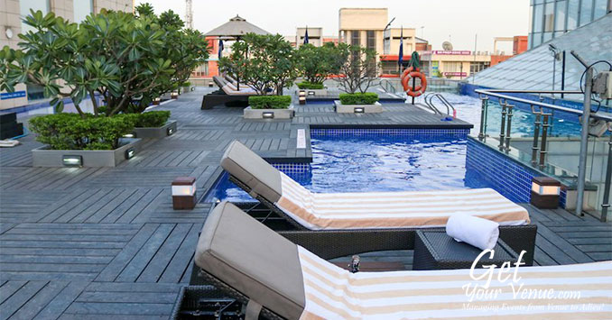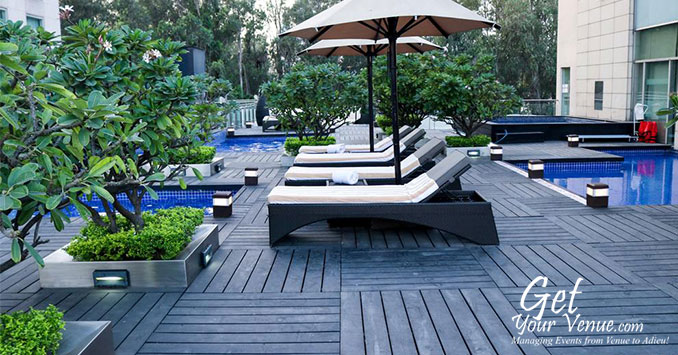 Poolside – A 8,000 sq ft large garden by the poolside, it provides an inspiring, serene setting for small, intimate events like pre-wedding cocktail parties, mehendi functions, Sangeet ceremonies, and post-wedding brunches. It has a seating capacity for 100 to 200 guests.
