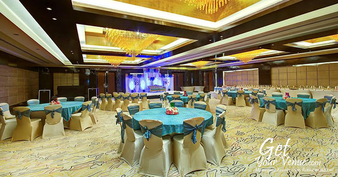 Amber Hall – This 7458 sq ft sized 5-star wedding hall in Ghaziabad has a seating capacity of 350 to 800 guests. The Amber is the ideal choice for those looking to hold large, extravagant events like cocktails soirées, Sangeet nights and wedding receptions.