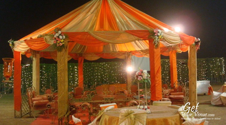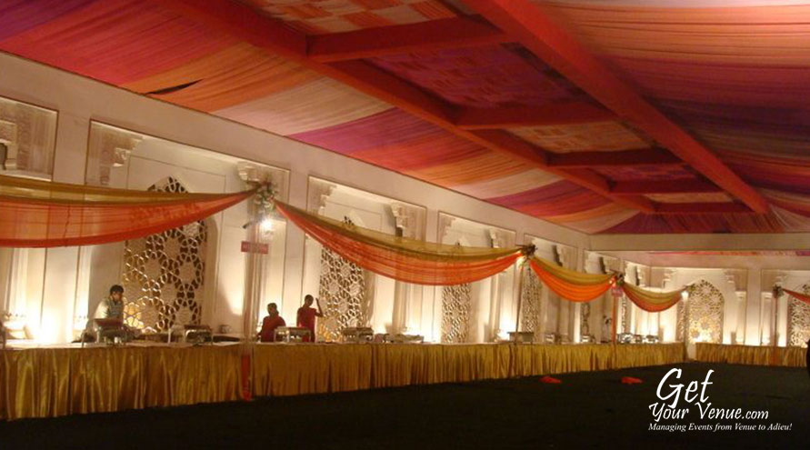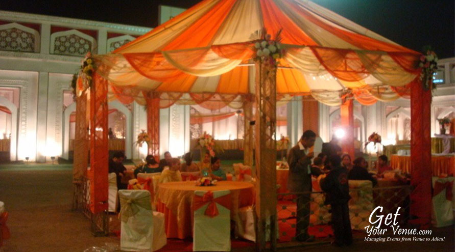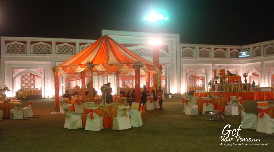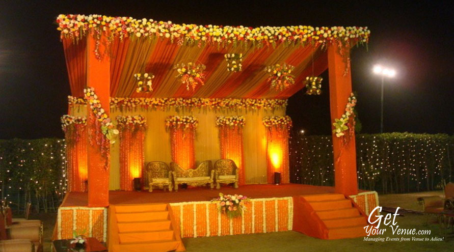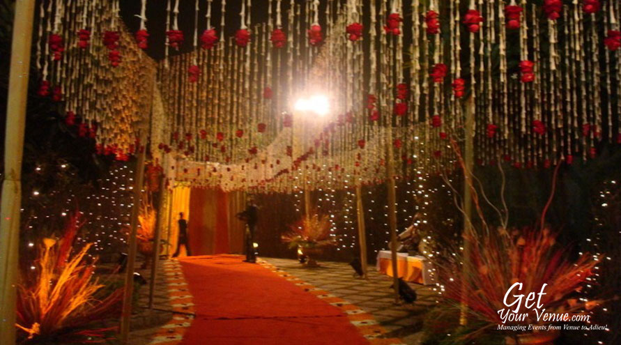 The vast expanse of verdant lawns adds subtle charm to your wedding venue. It ensures your esteemed guests having enough room to meet and greet without bumping into each other. Lovely lighting effect and floral décor make the space more elegant.