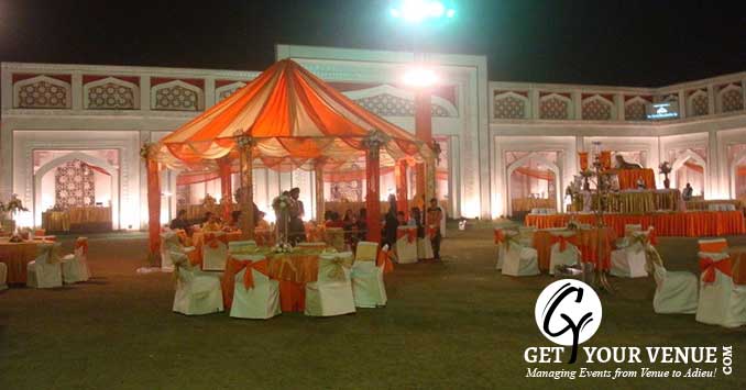 The vast expanse of verdant lawns adds subtle charm to your wedding venue. It ensures your esteemed guests having enough room to meet and greet without bumping into each other. Lovely lighting effect and floral décor make the space more elegant.