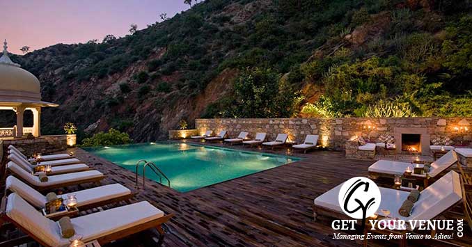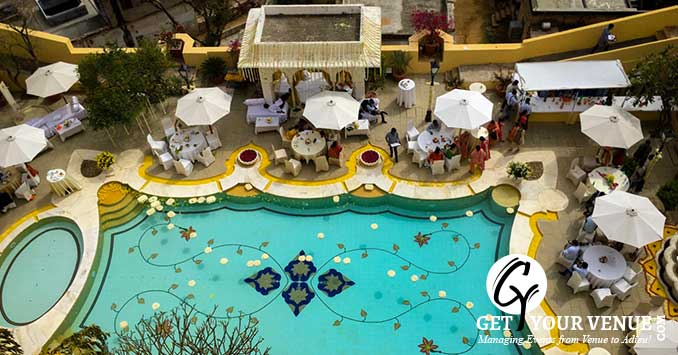 Pool Side Area - A perfect recreational area to have a leisure –time. An outdoor zone comprising of marble and artistically designed in a mosaic-like pattern swimming pool surrounded by the Aravalli range is no less than a delight for the visitors. Special attractions include a wading pool and Jacuzzi for the children. Spacious and wide enough to host 200-700 persons at a time.
