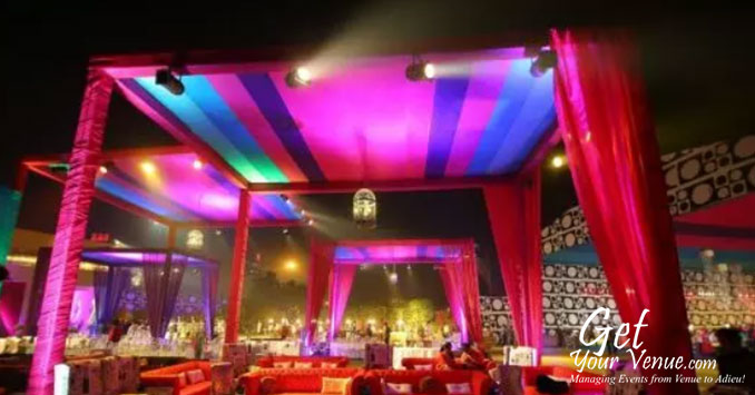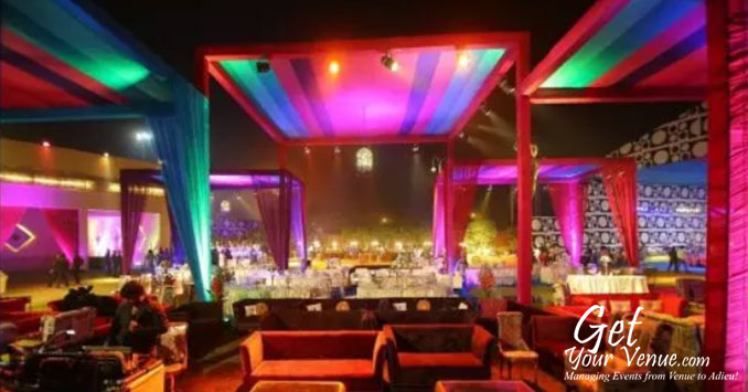 The vast expanse of verdant lawns adds subtle charm to your wedding venue. It ensures your esteemed guests having enough room to meet and greet without bumping into each other. Lovely lighting effect and floral décor make the space more elegant.