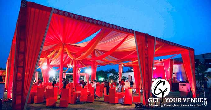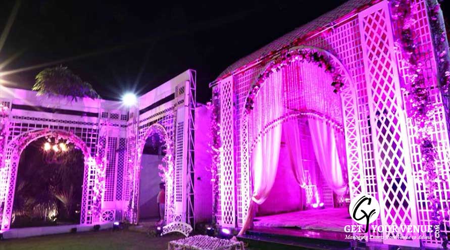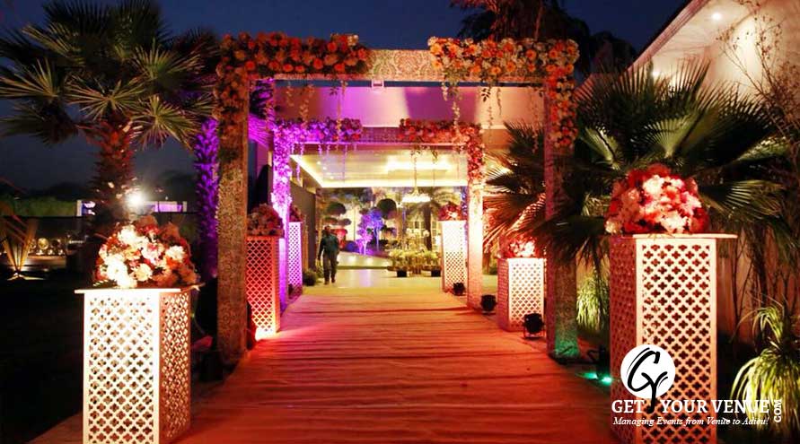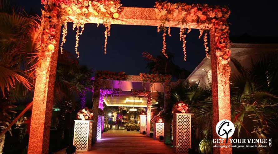 The vast expanse of verdant lawns adds subtle charm to your wedding venue. It ensures your esteemed guests having enough room to meet and greet without bumping into each other. Lovely lighting effect and floral décor make the space more elegant.