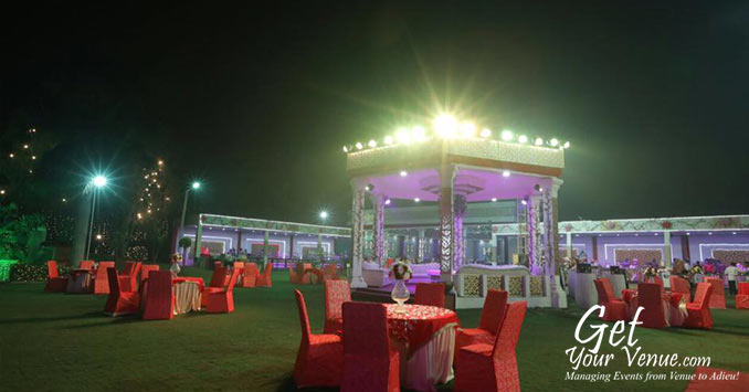 Located along the main highway, Suraj Vatika is a luxurious wedding farmhouse in North Delhi that boasts of having one of the most striking locations. Situated on the GT Karnal Road near the NH1, the place is easily accessible from many NCR regions. Its extensive property features beautiful scenery created by a combination of viridescent vegetation, sprawling lawns, and elegant décor. The venue is set in decent acreage of beautifully landscaped land with a large waterproof shed exclusively covered for the purpose of dining. With an intake of 1200 people at a time, it has 2 fully embellished rooms for the convenience of the bride and groom parties. Abundant space for parking is available for about 275 vehicles within the premises. Executive valet parking can also be availed. This wedding venue in Delhi farm offers a stunning backdrop for romantic wedding photographs and outdoor wedding ceremonies. What’s more, Suraj Vatika provides you with a blank canvas that you can decorate and transform to make your dream wedding a quintessential reality. Rest assured your wedding experience at this stunning, outdoor wedding venue in North Delhi will be nothing short of magical.