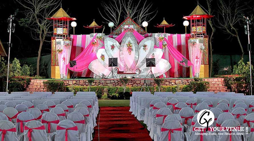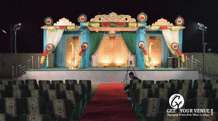 The vast expanse of verdant lawns adds subtle charm to your wedding venue. It ensures your esteemed guests having enough room to meet and greet without bumping into each other. Lovely lighting effect and floral décor make the space more elegant.