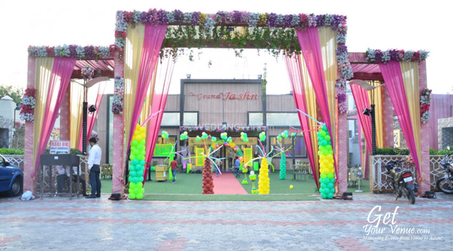 Stylish interiors, stunningly beautiful lighting effects and comfortable seating arrangements make this banquet hall perfect for a glittery wedding affair. The beautifully laid tables and chairs ensure an idyllic setting. The vast expanse of verdant lawns adds subtle charm to your wedding venue. It ensures your esteemed guests having enough room to meet and greet without bumping into each other. Lovely lighting effect and floral décor make the space more elegant.