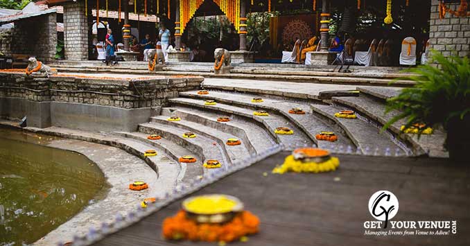 THE POND - Beneath the tamarind tree, the soul of the place, lies a natural pond. Old temple steps surround, and a watchful Basava looks upon it. A great place to have a great night with your loved ones and celebrate all your pre-wedding functions which can accommodate a small gathering of around 350 guests.