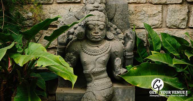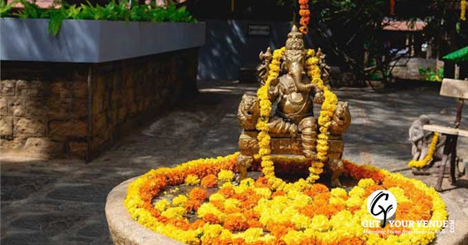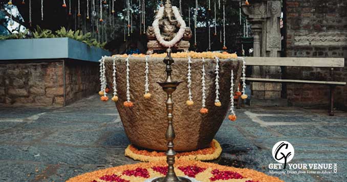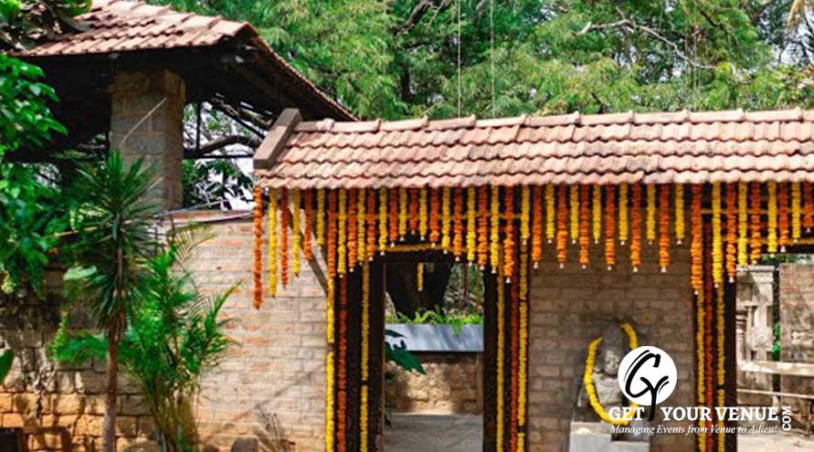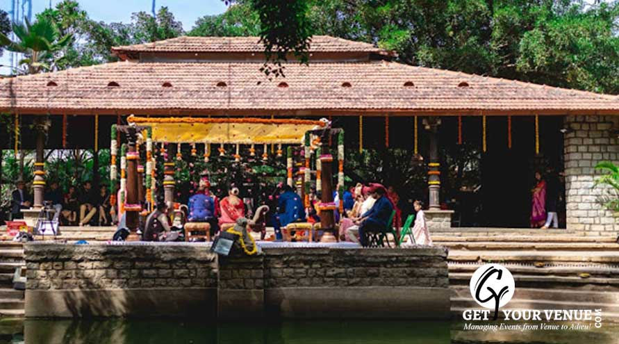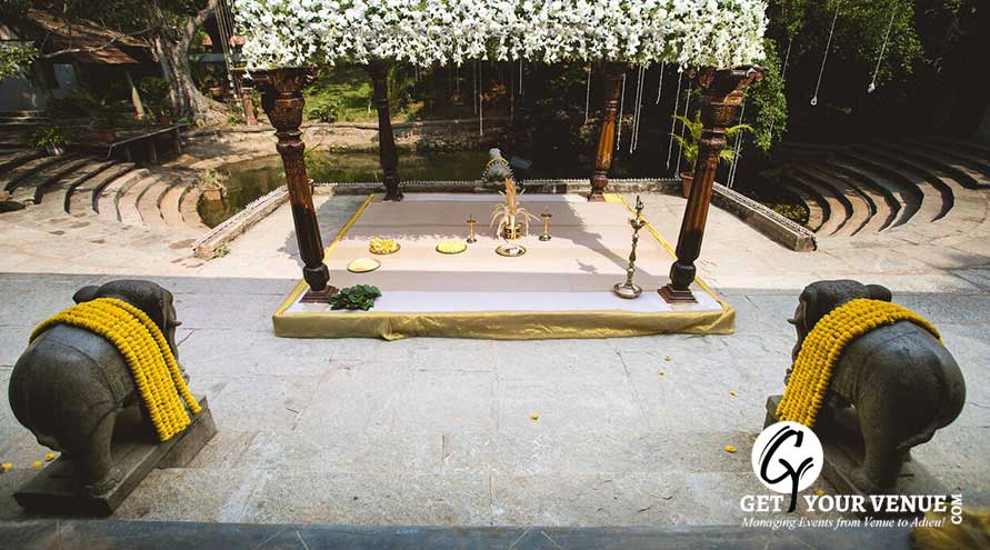 RANGASTALA - The Rangastala or Vishnu Mantapa is an beautiful wedding space in Bangalore that allows for smaller group gatherings of around 250 guests. With a Vishnu sculpture at its center, this space blooms amidst the beauty of pure bliss. The Rangasthala has a stage with a roof above while the rest of the space is open to the sky!