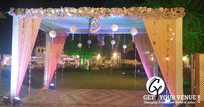 The vast expanse of verdant lawns adds subtle charm to your wedding venue. It ensures your esteemed guests having enough room to meet and greet without bumping into each other. Lovely lighting effect and floral décor make the space more elegant.